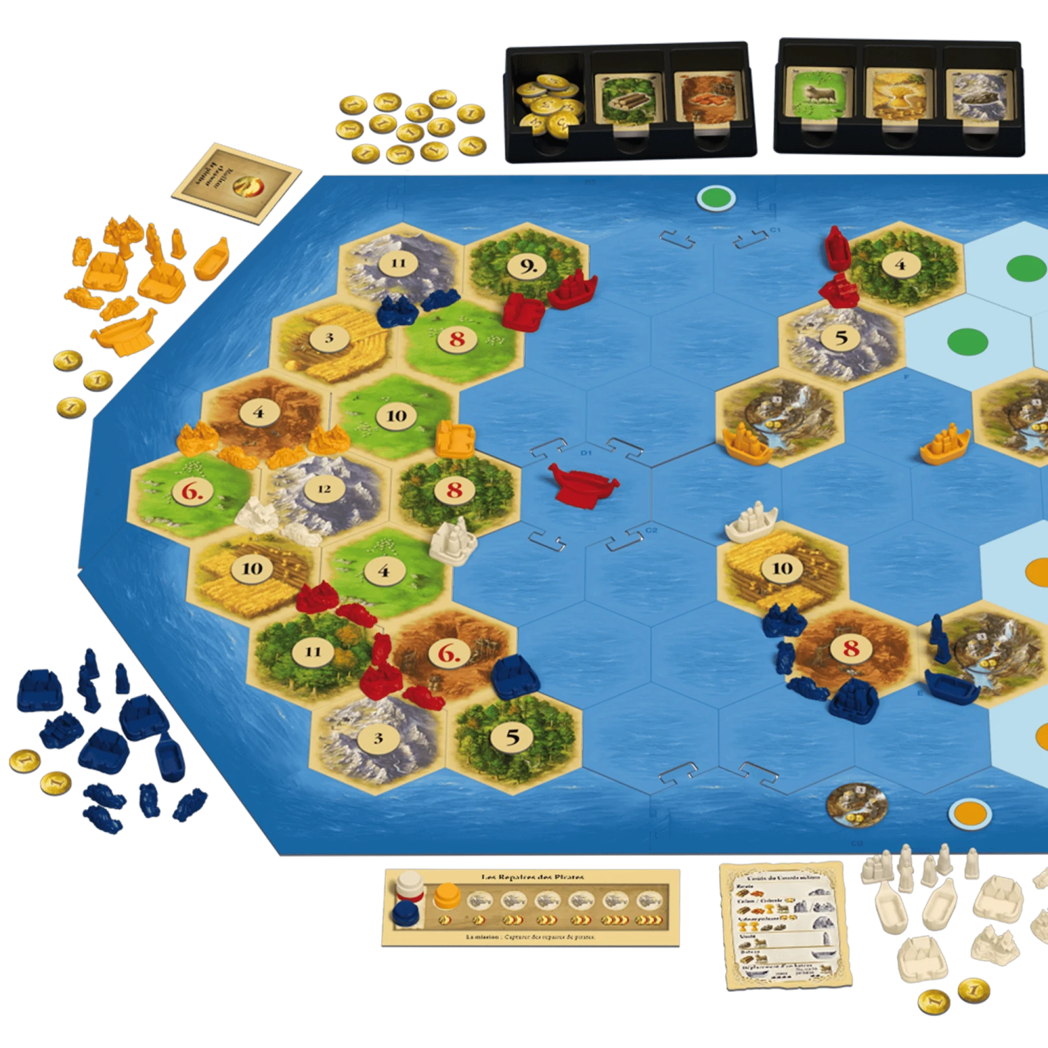 Explorez des territoires inconnus, devenez marchand d’épices, pêcheur et pirate dans l’extension Catan : Villes et Chevaliers ! L’île de Catan est maintenant recouverte de villes et de colonies, et il est temps de partir à l’aventure pour vous enrichir. Exploitez les rivières, troquez des poissons fraîchement pêchés, et engagez des échanges avec les nomades du désert. Avec l’aide de chevaliers, protégez le littoral de Catan contre les invasions barbares, et œuvrez pour restaurer la splendeur du château abritant le Conseil de Catan.