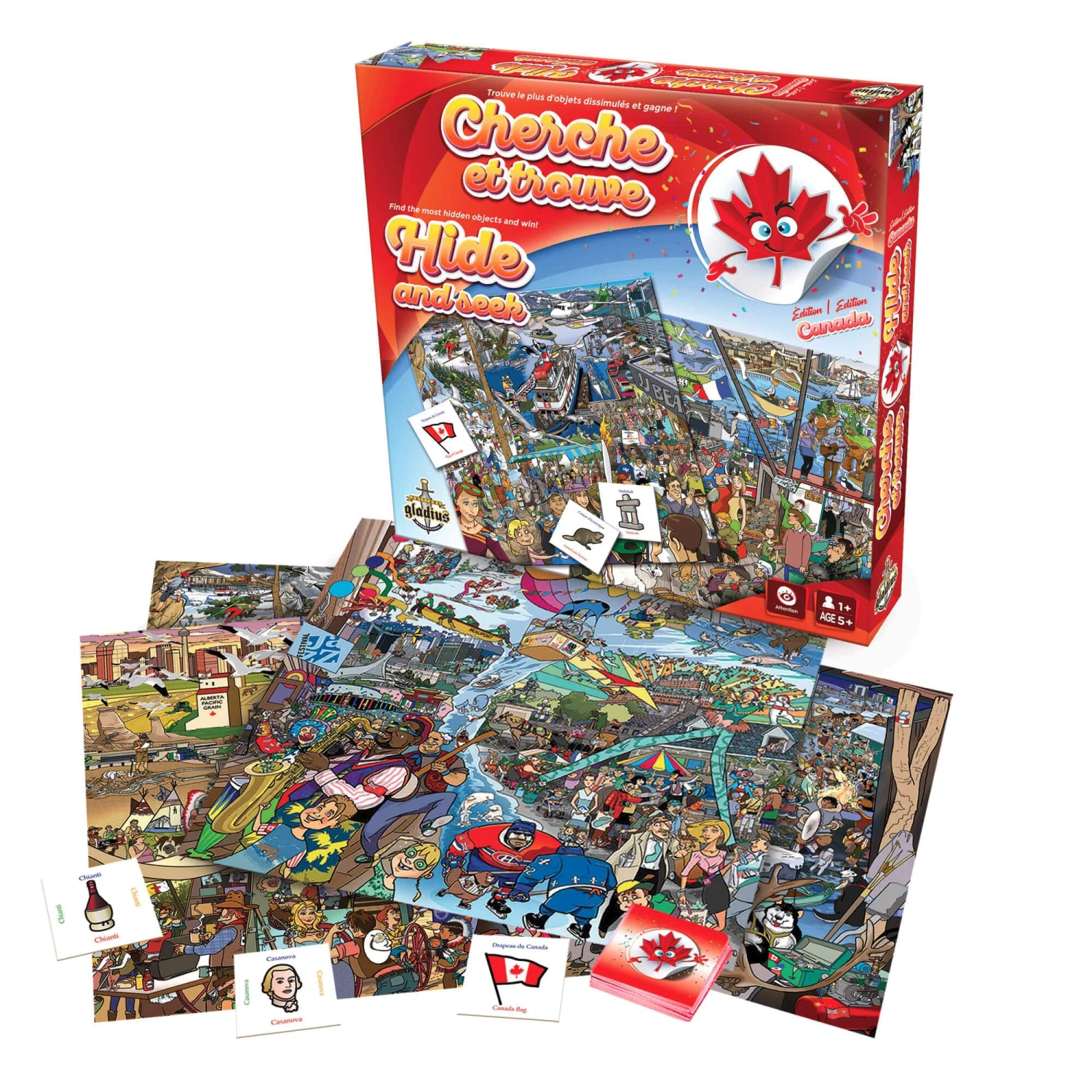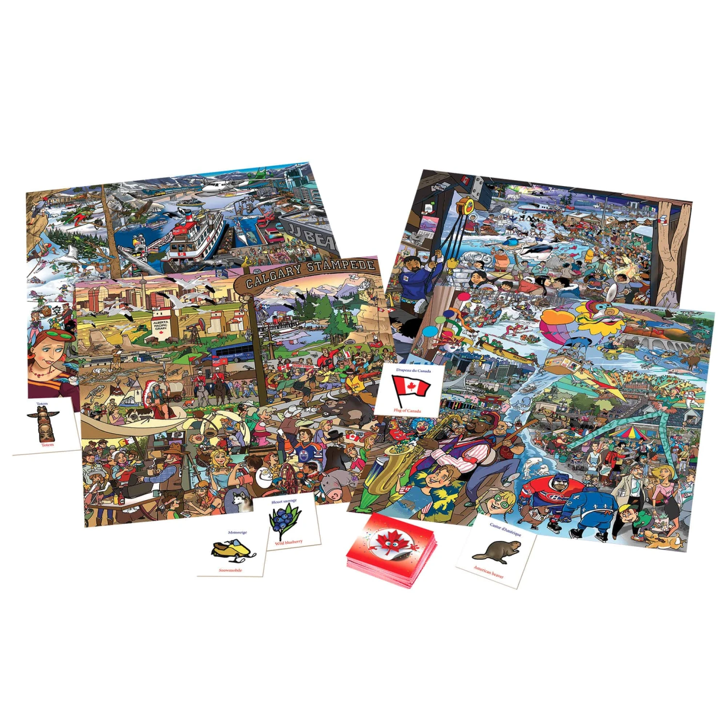 Visitez le Canada et découvrez treize provinces et territoires uniques, avec leurs contrées sauvages d’une incroyable diversité, leurs attraits touristiques et leurs sites historiques exceptionnels. Ce jeu développe le sens de l’observation et la concentration chez les joueurs de tout âge. Retrouvez les illustrations dissimulées sur les planches de jeu et amassez le plus de cartes possible. Pour plus de défi, recherchez les 13 emblèmes floraux et les drapeaux des provinces et territoires. Une visite excitante, remplie de découvertes et de défis à relever vous attend !