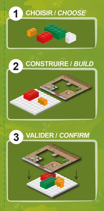 Appel à tous les architectes ! Venez construire une grande ville de blocs ! Le but du jeu : être le premier à placer ses blocs correctement sur ses trois terrains de construction : maison, école et supermarché. Attention, dans le secteur de la construction on ne sait jamais ce qui peut arriver… Le premier joueur qui complète son quartier (ses trois terrains de construction) a gagné!