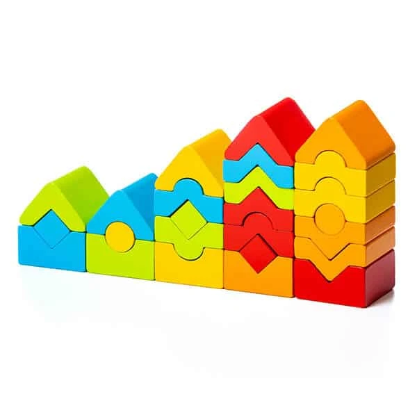 Ce jouet est constitué d’un ensemble de 24 pièces vibrantes, chacune arborant une couleur et une forme distinctes. Il invite l’enfant à explorer son imagination en créant des pyramides fidèles aux schémas illustrés sur l’emballage, ou bien à concevoir librement d’autres structures originales.
