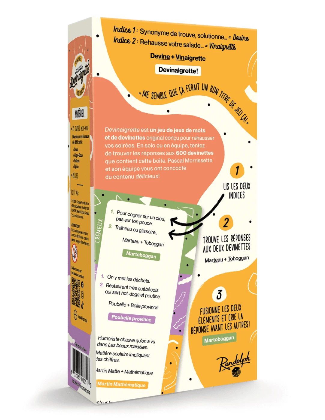 Devinaigrette est un jeu de mots et de devinettes ingénieux conçu pour pimenter vos soirées. Que vous jouiez en solo ou en équipe, le défi consiste à résoudre 600 devinettes ingénieuses qui vous attendent dans cette boîte, le tout avec la touche créative
