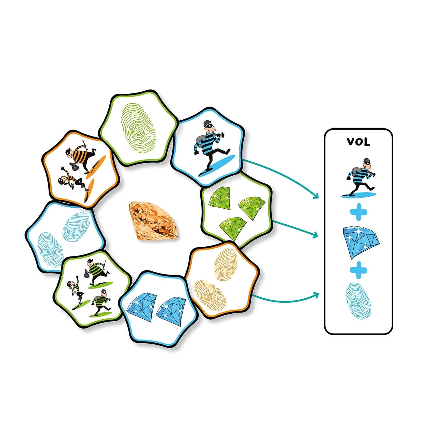 Sois le premier à repérer une combinaison correcte de 3 cartes (diamant + voleur + empreinte digitale) ayant toutes le même nombre ou un nombre différent d’éléments. Saisis en premier le diamant orange, indique le »vol » et récolte des cartes !