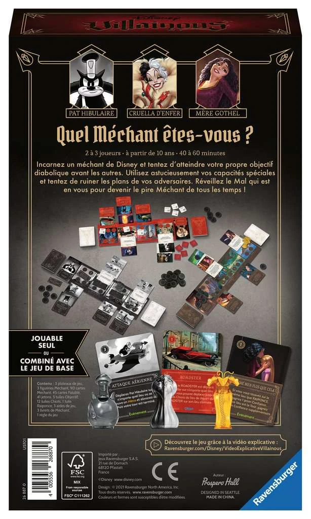 Incarnez un méchant de Disney et tentez d’atteindre votre propre objectif diabolique avant les autres. Découvrez 3 nouveaux personnages, soit 3 nouveaux objectifs et 3 nouvelles manières de jouer pour devenir le plus grand méchant Disney : – Cruella d’enfer usera des pires ruses pour récupérer 99 chiots et s’en faire un manteau – Mère Gothel tentera d’empêcher Raiponce de retourner à Corona en gagnant sa confiance – Pat Hibulaire devra réaliser non pas 1 mais 4 objectifs pour devenir le plus grand Méchant de Disney ! Utilisez astucieusement vos capacités spéciales et tentez de ruiner les plans de vos adversaires. Cette extension de Villainous, le jeu le plus diabolique de l’année, est jouable avec ou sans le jeu de base. Réveillez le Mal qui est en vous et devenez le pire Méchant de tous les temps ! Dès 10 ans.