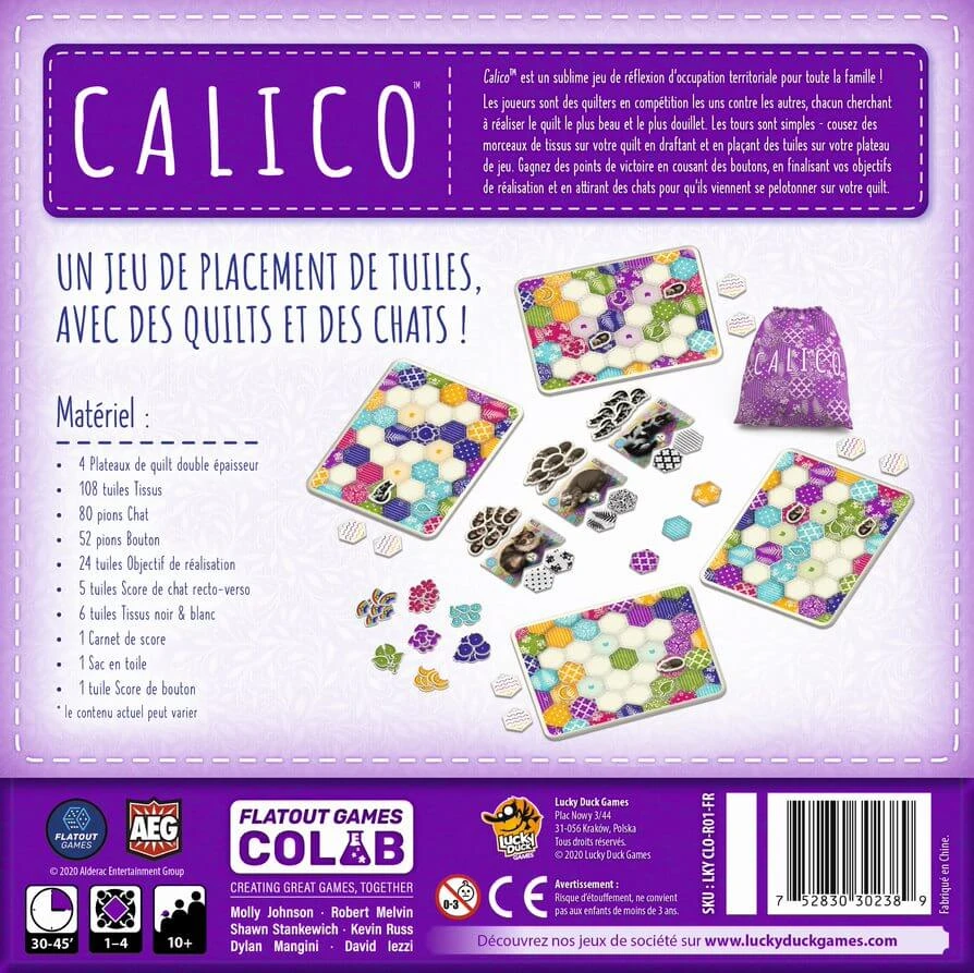 Calico est un jeu de placement de tuiles dont l’objectif principal est de créer la couverture la plus douillette et d’attirer le plus de chats possible. Les joueurs, en compétition les uns contre les autres, vont tenter de composer la couverture la plus attrayante en plaçant des tuiles de tissus de différentes couleurs et avec différents motifs sur leur plateau. Le joueur qui gagnera le plus de points grâce à ses objectifs de réalisation, ses chats et ses boutons l’emportera !