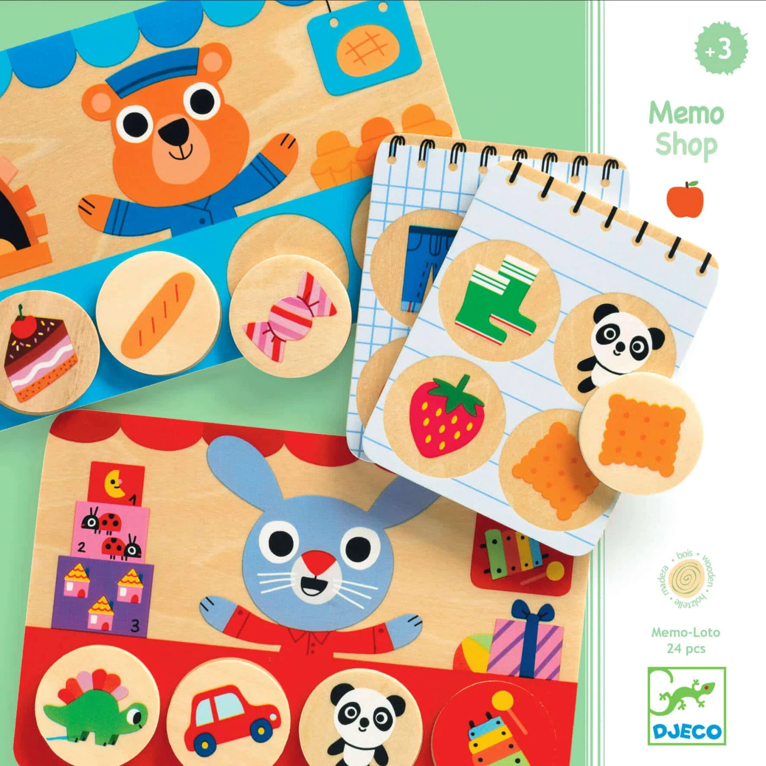 Jeu de mémoire éducatif tout en bois pour les enfants de 3 ans où ils devront aller faire les courses sans se tromper.