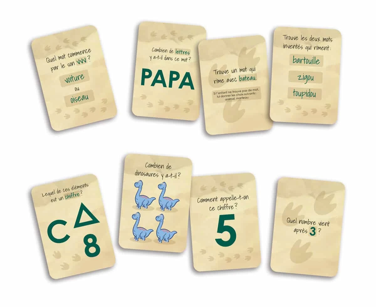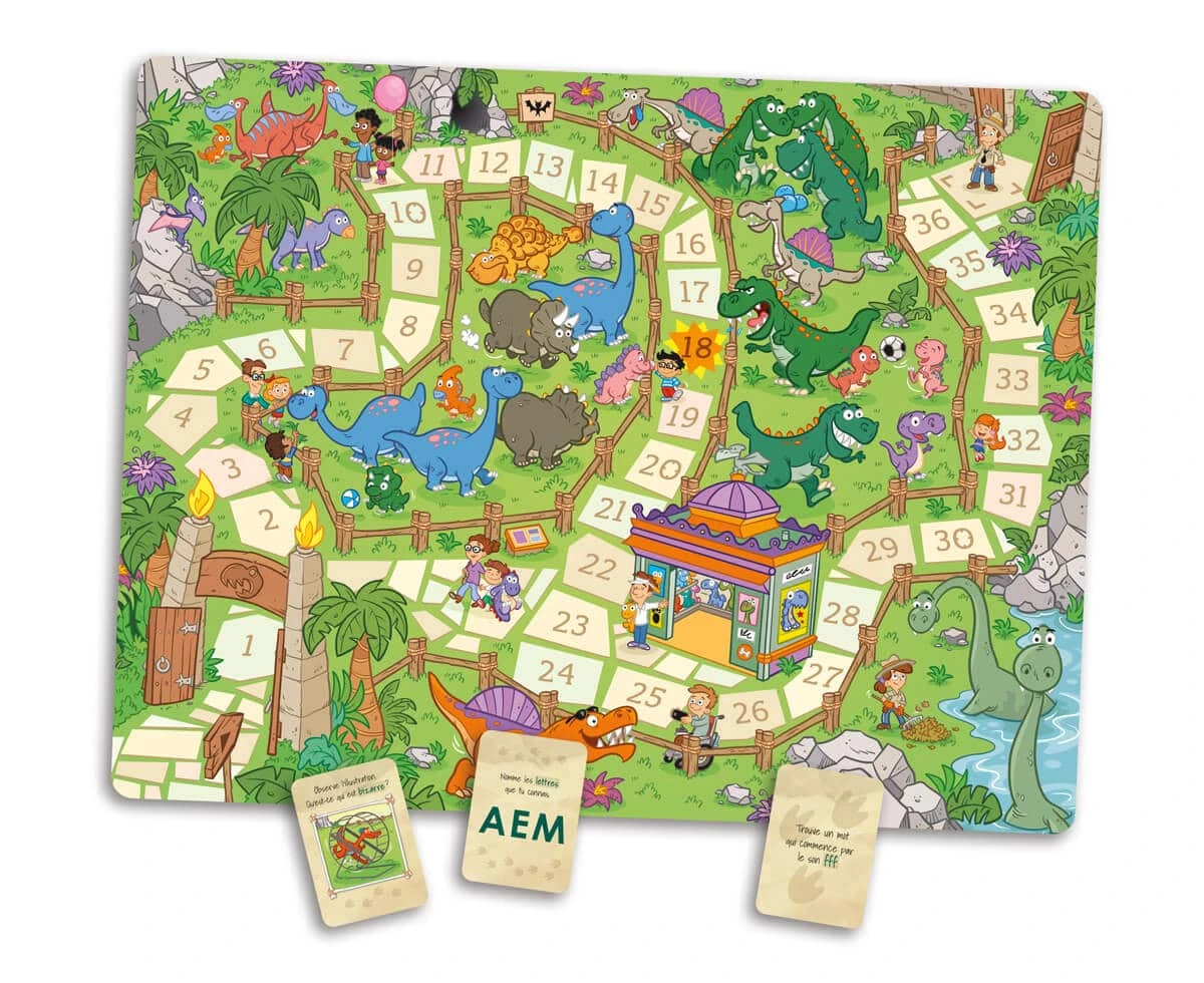 En mission chez les dinosaures a été conçu pour soutenir le développement global de l’enfant de 4 ans à 5 ½ ans. Dans ce jeu de parcours, l’enfant cherche notamment à reconnaitre des émotions et leurs causes, à décrire à l’oral des situations bizarres vécues par des dinosaures, à reconnaitre les nombres de 0 à 10 et quelques lettres de l’alphabet, ainsi qu’à prendre conscience des sons qui composent les mots.