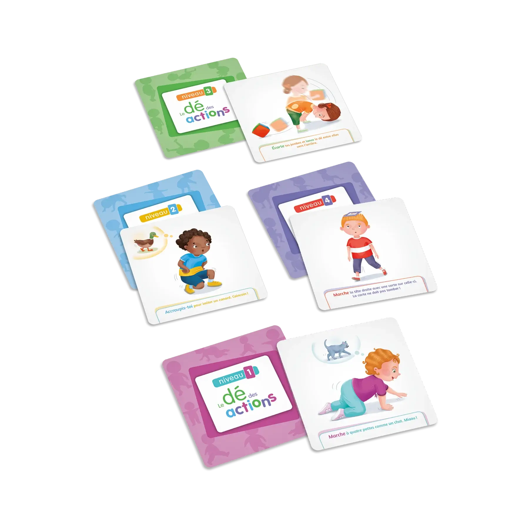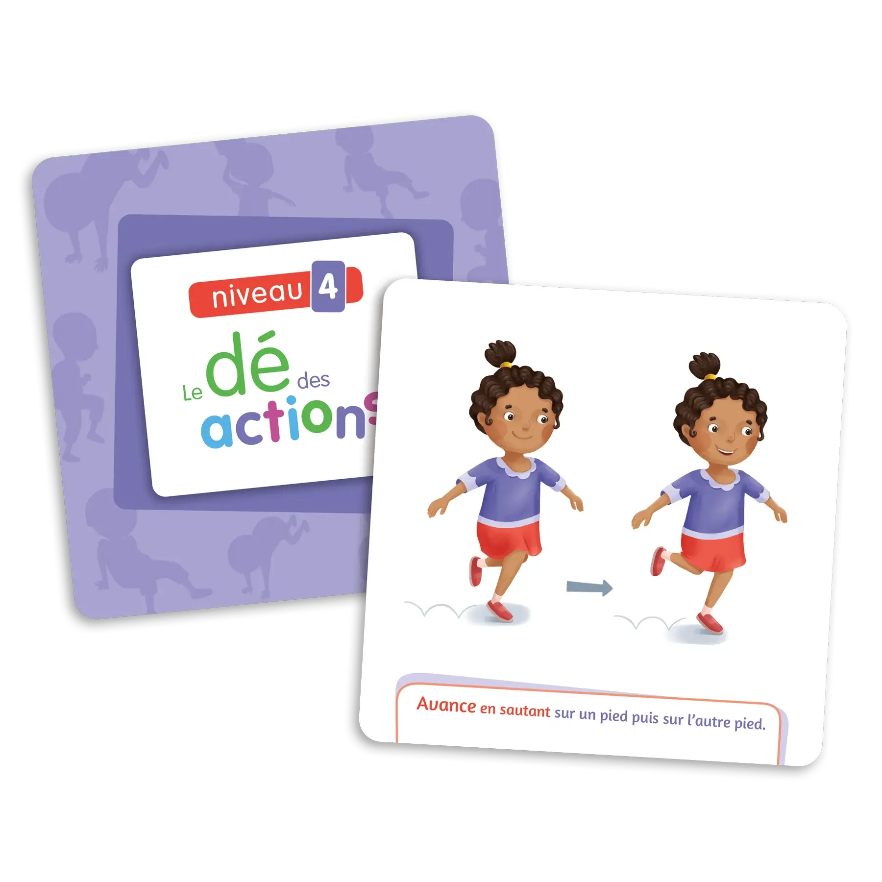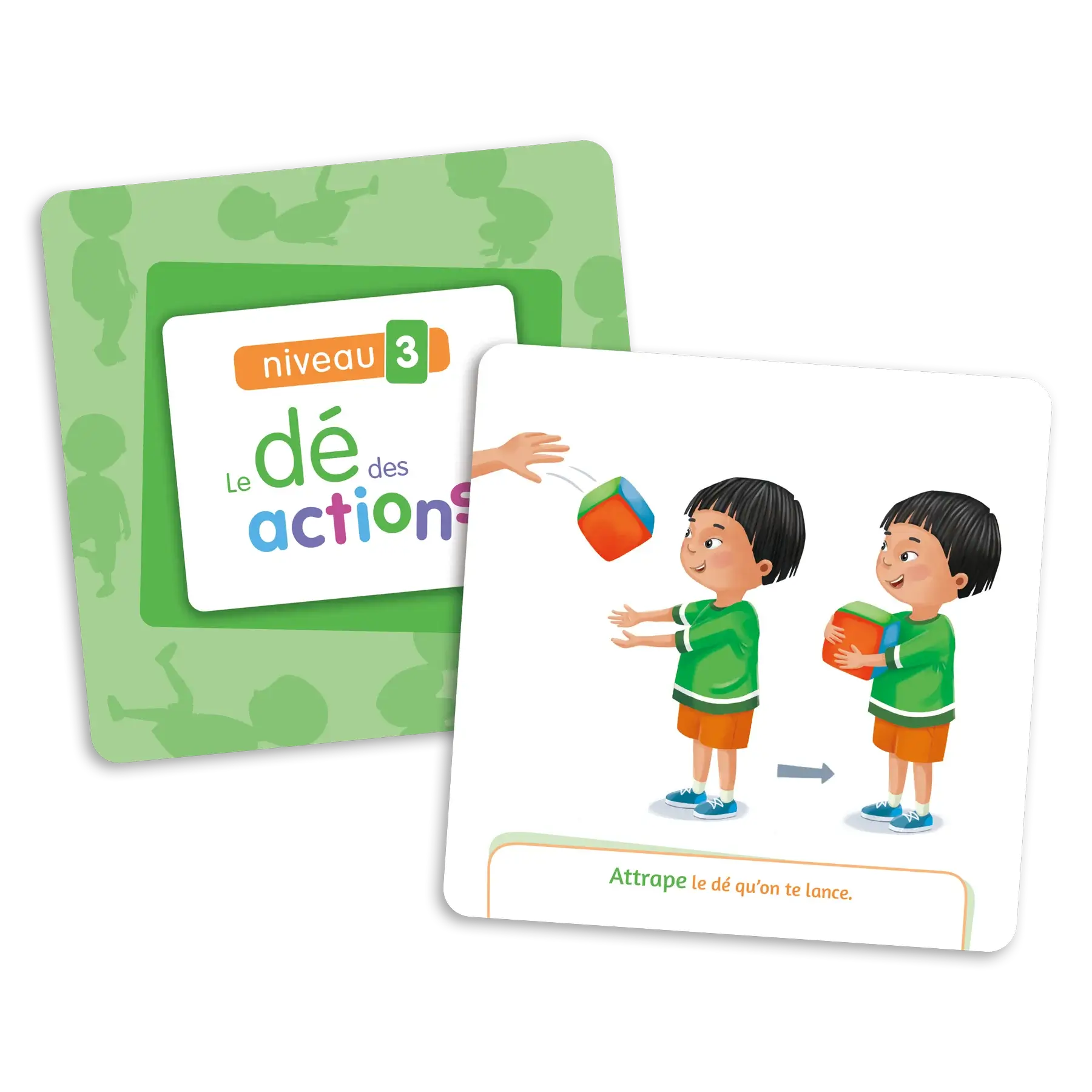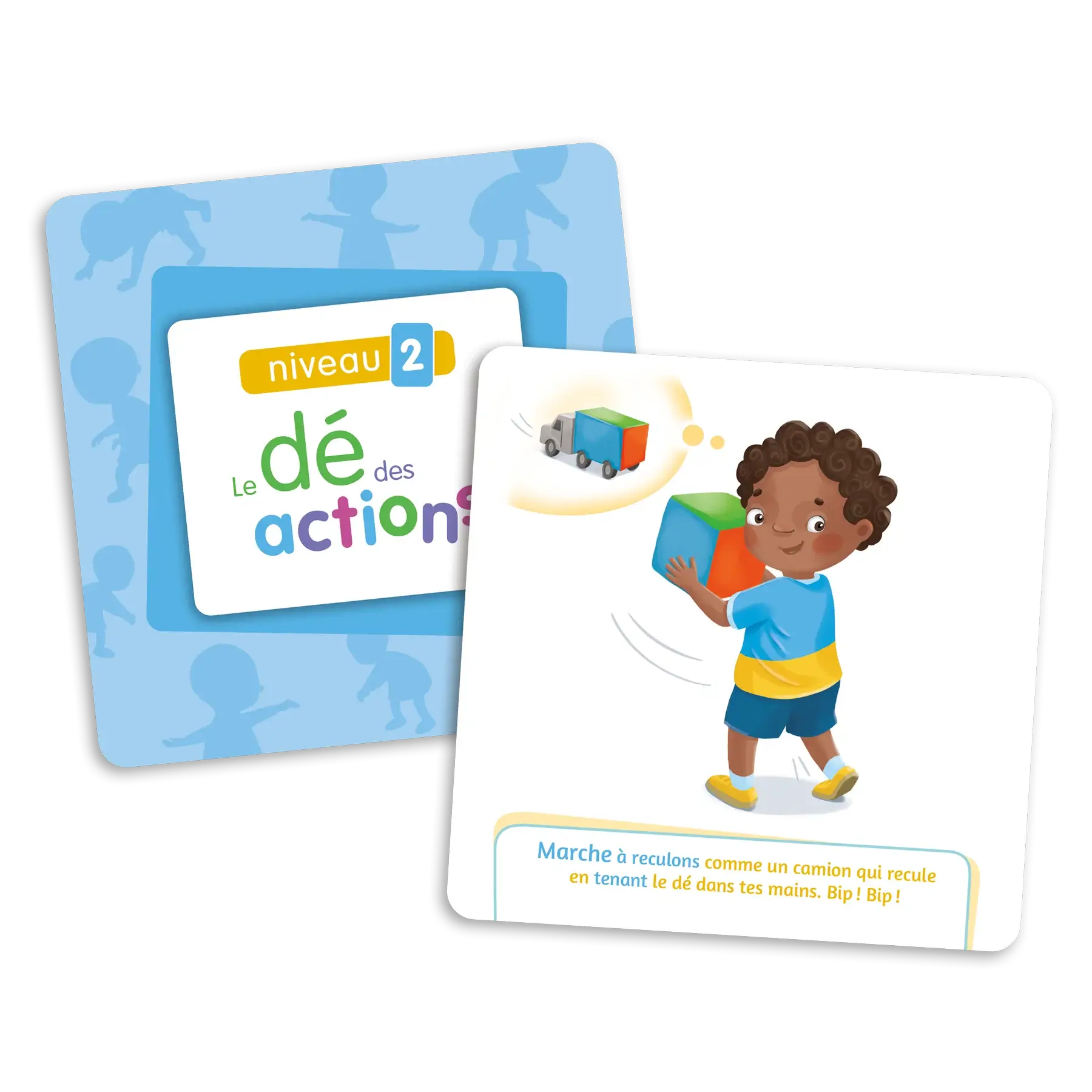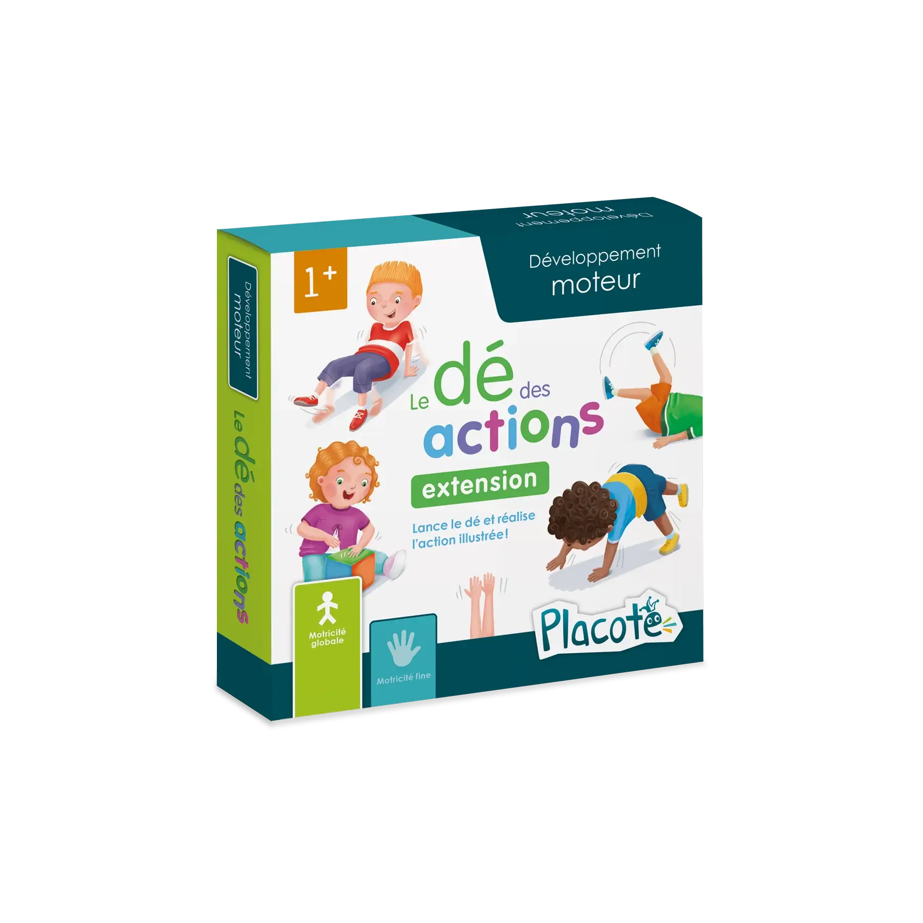 Le dé des actions est conçu pour aider les enfants de 1 à 6 ans à développer leurs compétences motrices. Cette extension du jeu « Le dé des premiers mots » offre 60 nouvelles cartes-images réparties en 4 niveaux, qui peuvent être insérées dans les pochettes du dé. Les illustrations représentent des actions à effectuer pour stimuler le développement d’habiletés motrices, telles que ramper, s’accroupir, se tenir en équilibre, sauter, etc. Le jeu contribue ainsi à l’acquisition de compétences fondamentales pour le développement de la motricité globale de l’enfant.