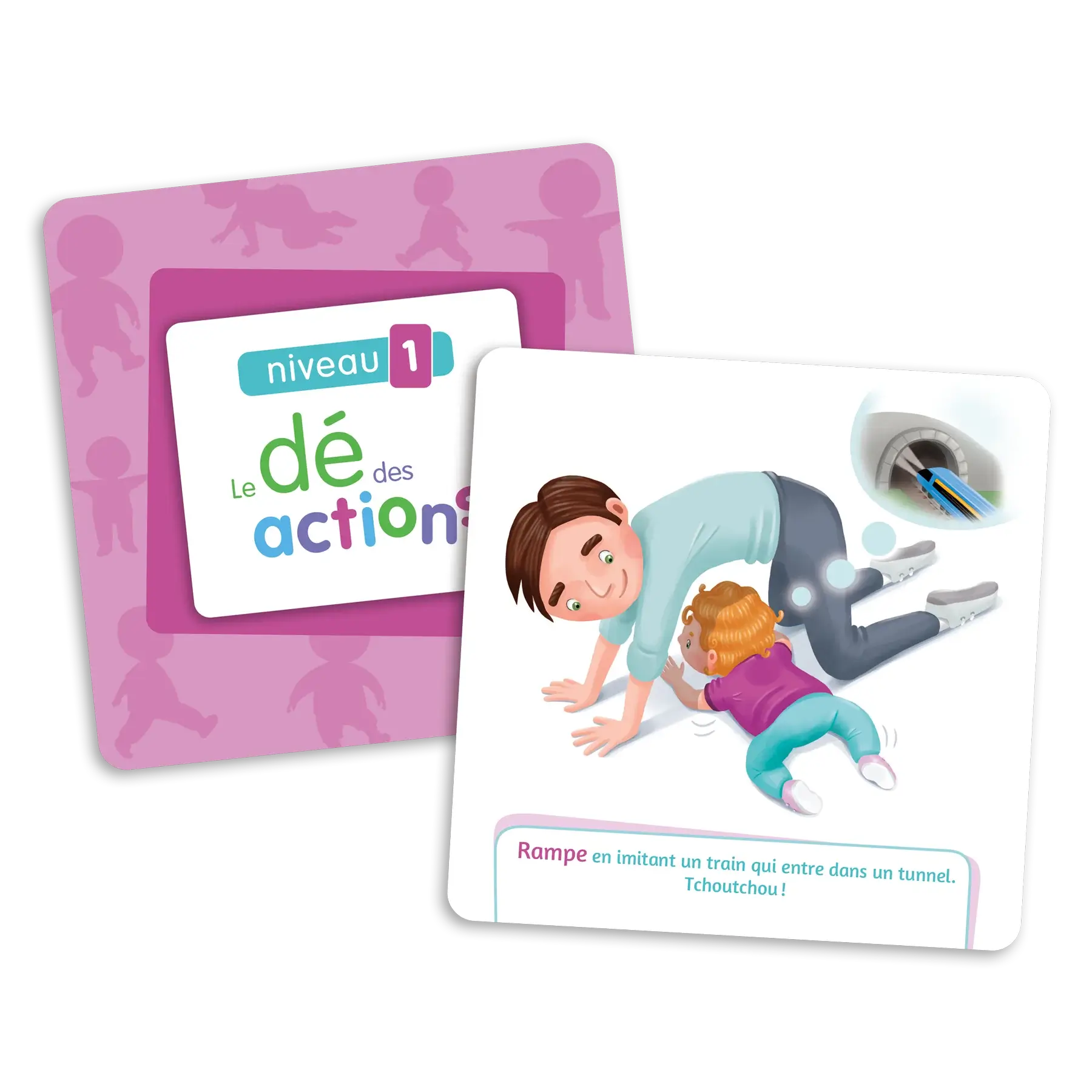 Lance le dé en l’air et reproduis l’action illustrée ! Rampe en imitant un train qui entre dans un tunnel ! Tourne comme une toupie sur toi-même ! Tiens-toi en équilibre sur un pied comme un flamant rose ! Marche comme un crabe sans que tes fesses touchent le sol ! Réalise toutes sortes de mouvements amusants, avec ou sans l’aide d’un adulte !