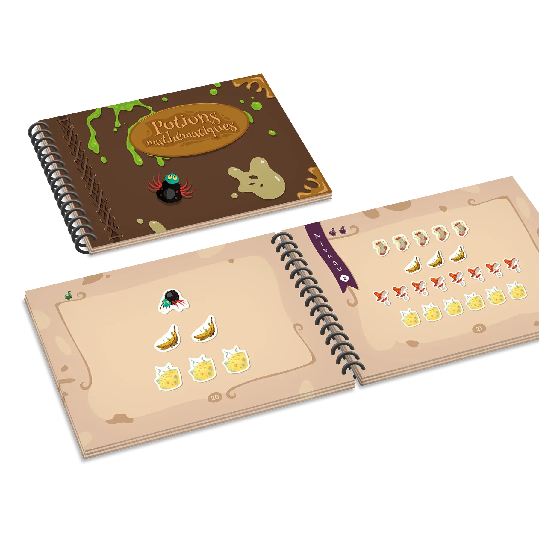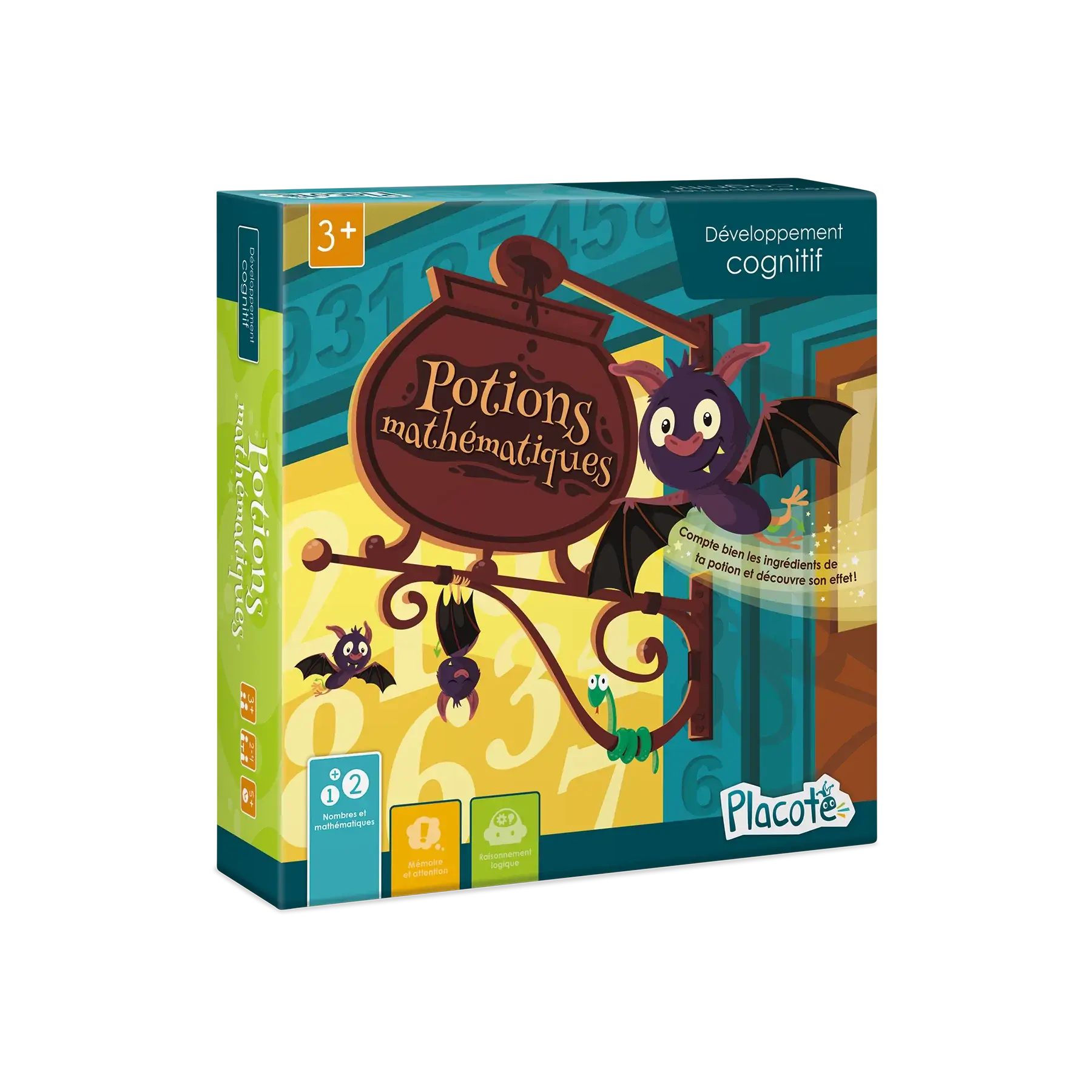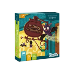 Potions mathématiques est conçu pour aider les enfants de 3 ans à 6½ ans à apprendre à compter et à reconnaitre les nombres écrits de 1 à 10. Le fait d’avoir à dénombrer des ingrédients farfelus comme des bananes pourries et des chaussettes qui puent les motive dans leur apprentissage.