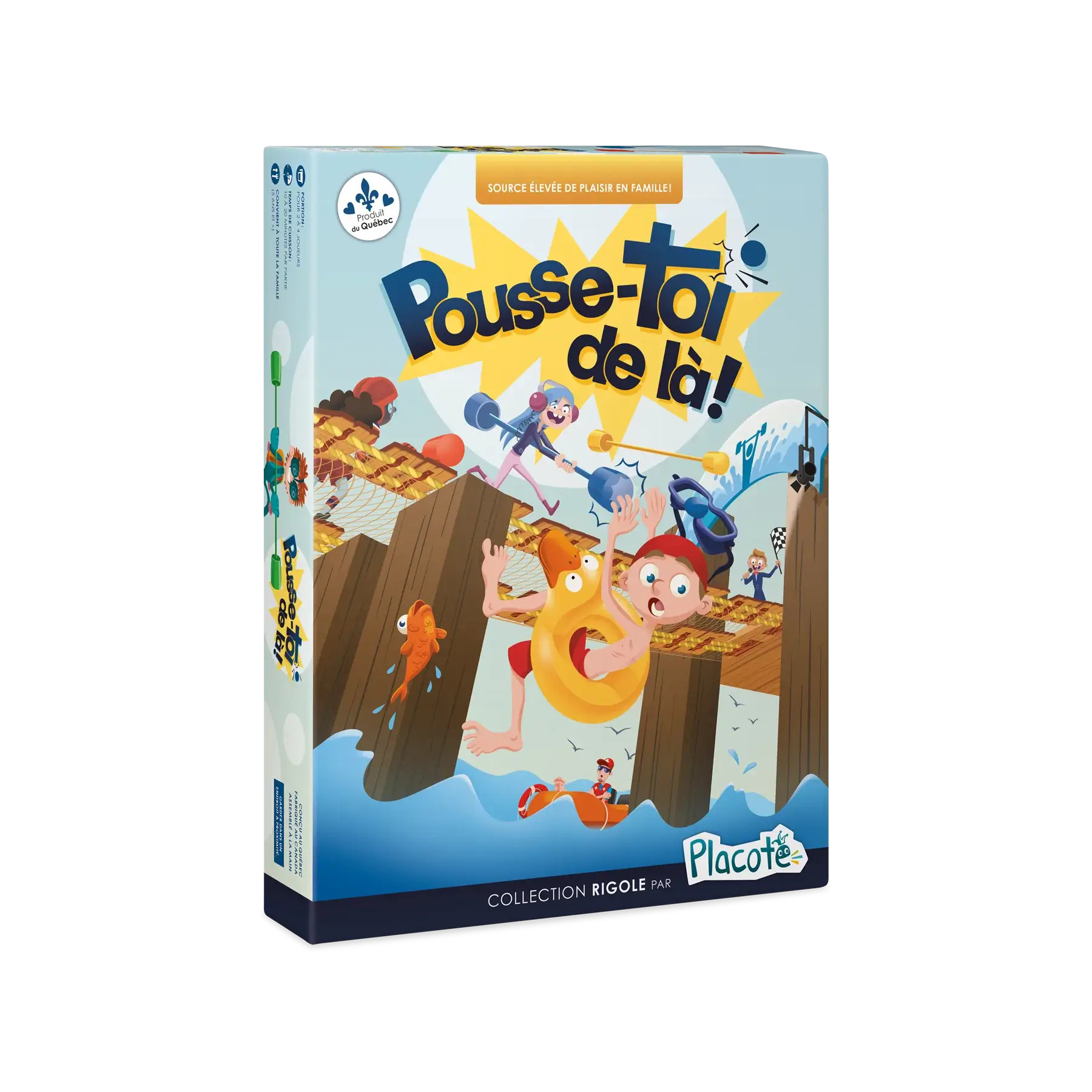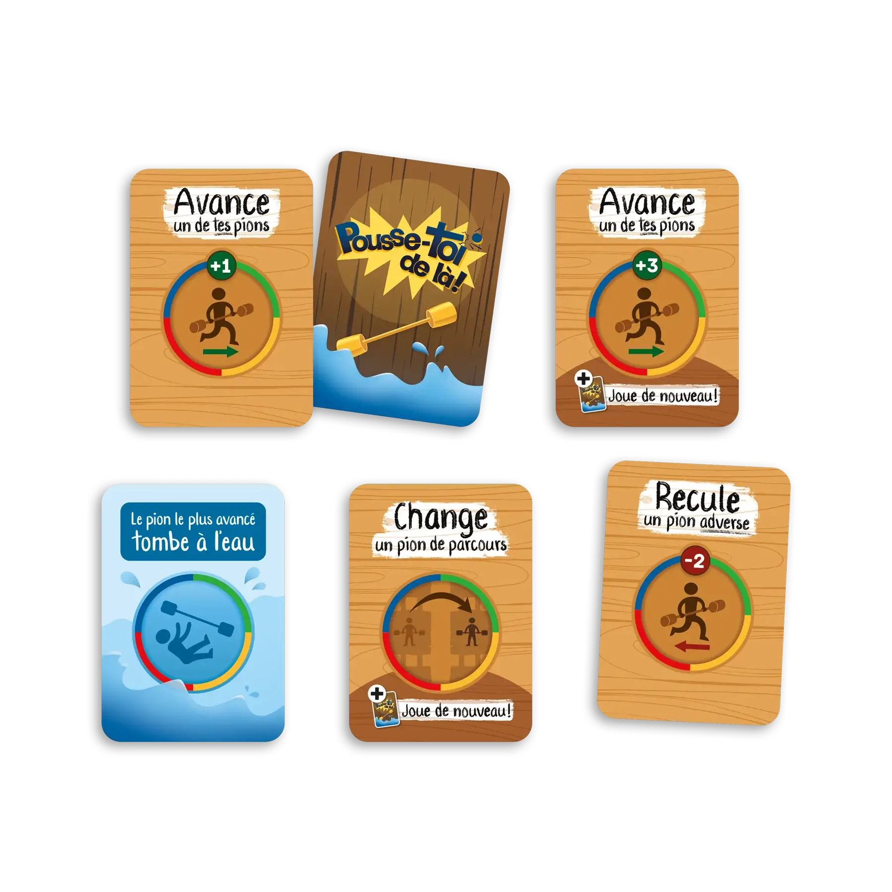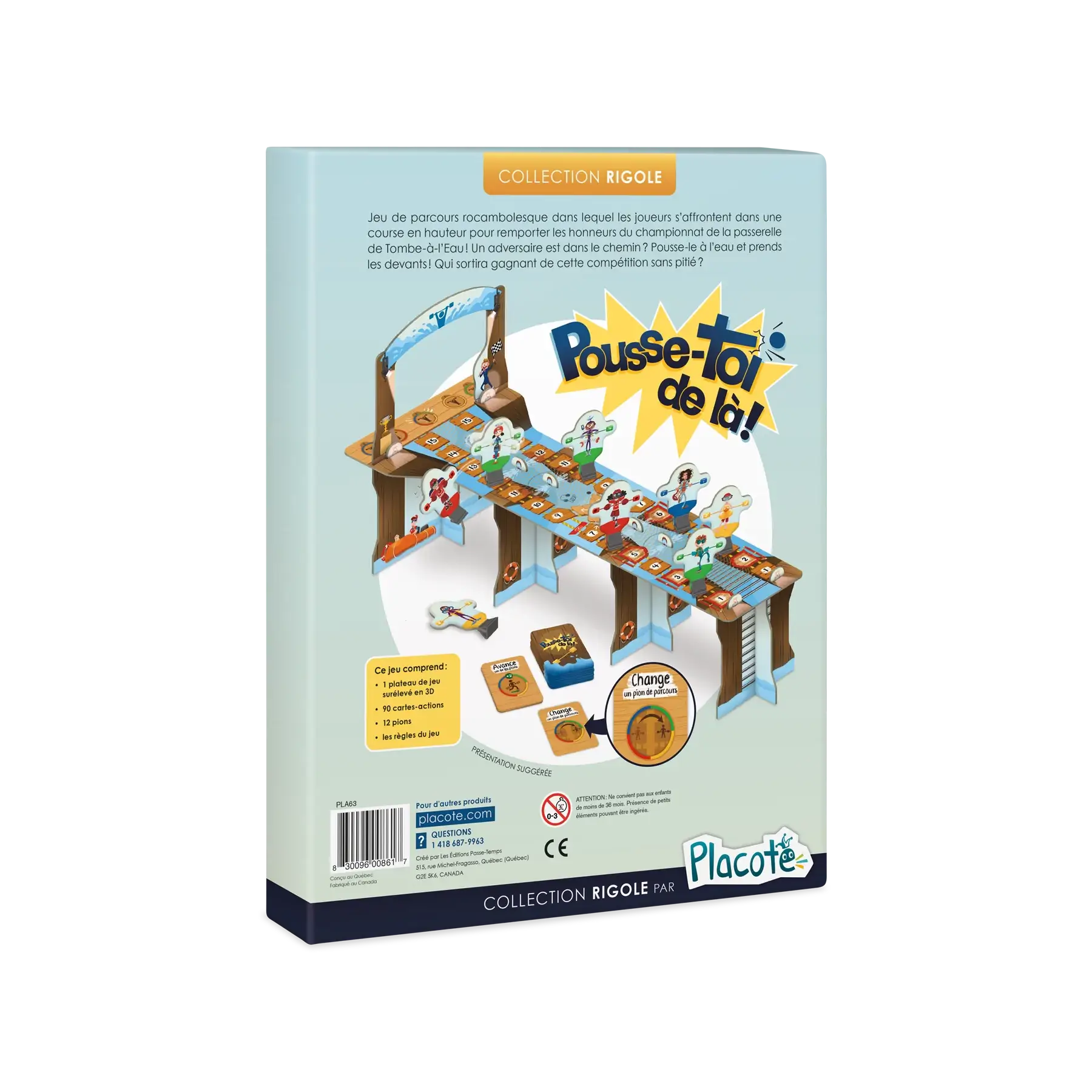 Pousse-toi de là! est un jeu de parcours familial dans lequel les joueurs s’affrontent dans une course en hauteur. Les joueurs tournent des cartes-actions qui font par exemple avancer un de leurs pions, reculer le pion d’un adversaire ou changer un pion de parcours. Chaque fois qu’un pion arrive sur la même case que le pion d’un adversaire ou en dépasse un, le joueur pousse le pion adverse en bas du plateau de jeu (il le «pousse à l’eau»!). Le joueur qui parvient à amener deux de ses pions à l’arrivée en premier remporte la partie. Êtes-vous prêts à prendre part à cette course rocambolesque?